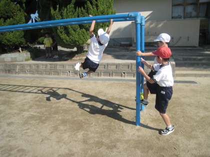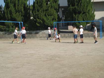朝の運動場の様子です。ドッジボールに興じるグループ、遊具で遊ぶ人たち、鬼ごっこで走っている人たちもいます。朝から子どもたちはエネルギーいっぱいに遊んでいます。