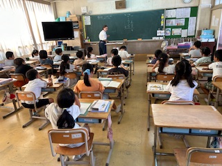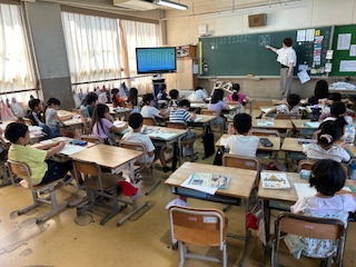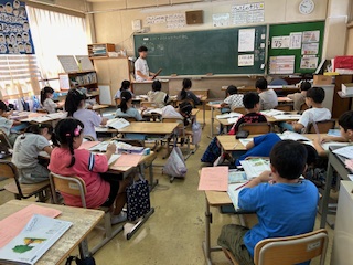 2年生の3クラスは算数です。繰り上がりの足し算ですが、2年生の新しい学びは、一の位が繰り上がり、さらに十の位も繰り上がるダブル繰り上がりです。慎重に計算を進める力を育てたいです。