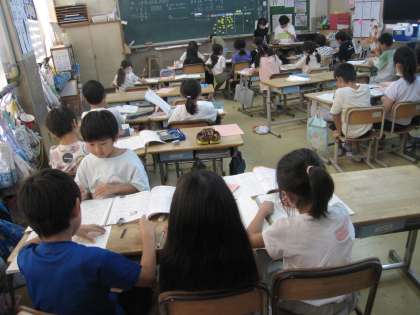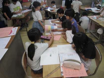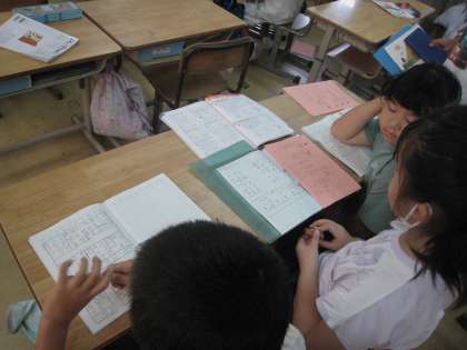 2年生の1クラスは、算数の授業です。小グループでお互いの理解を確認しながら和やかに学習が進んでいます。