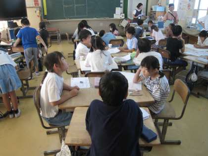 スーパーマーケットへの訪問学習から帰った3年生の1クラスです。ここでは、もう班でのみんなの学びを出し合ってのまとめ作業が始まっており、頭を寄せ合って積極的に進めています。