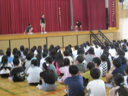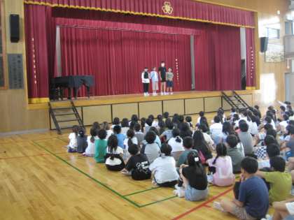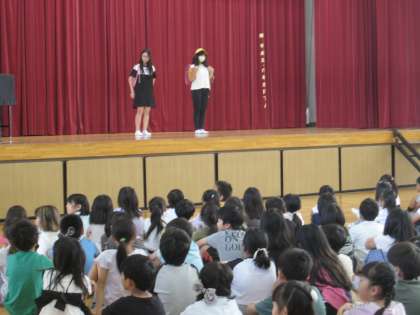 児童集会での生活委員会からの発表です。廊下を走らない、廊下の右側を歩く、黄帽をかぶる、見守り隊や旗持ち当番の保護者の方々に挨拶をする、などを寸劇仕立てで楽しくわかりやすく伝えました。(動きがあってブレが見えるものがあり見づらくてすみません)