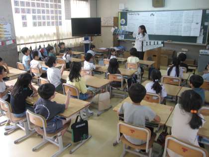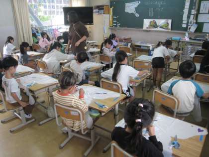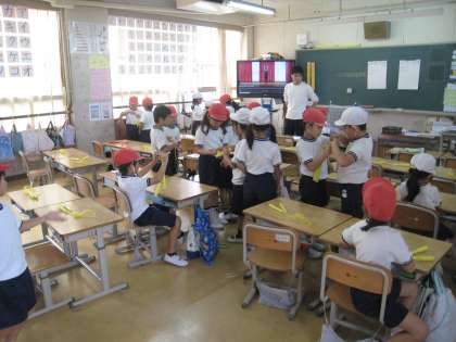 1年生は教科担任の授業で音楽、図工、体育の授業を学級担任や他クラスの担任の先生が教えています。音楽は「はなぺこあおむし」の曲ですが、木琴と鉄琴の紹介があっています。図工でははらぺこあおむしが蝶になった時のきれいなイメージを表現します。体育ではなわとびがはじまるので、なわとびのなわを結ぶ練習です。温かい学び合いが見えます。