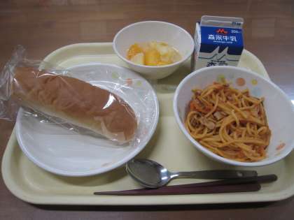 今日の給食は洋風!子どもたちの大好きなスパゲティナポリタンと大大大好きなフルーツ寒天です。