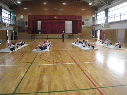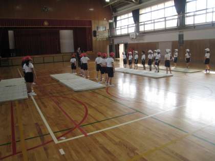 2年生のクラスが体育館でマット運動をしています。ゴロンゴロンと柔らかく丸くなる準備運動をしてから、二人ひと組で片方が前転をするのをもう片方がタブレットで映して、列の後ろに移って見合います。とても静かに整然と進んでいます。