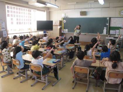 1年の1クラスです。先生が「マ」というと子どもたちは「わかるわかる」と宙に指で大きく「マ」を書いて指が揃っています。教室の後ろには大きなおひさまの顔が明るく掲示されています。オープンスクールで廊下にも教室にも保護者の方々が参観されています。