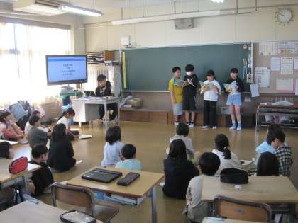 4年生の2クラスです。1クラスは国語「ごんぎつね」を班で発表しています。1クラスは漢字のドリルに取り組んでいます。廊下や教室には保護者の方々が子どもたちの様子を見守っています。