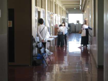 どの学年にもたくさん保護者の方が見に来ておられますが、とても静かで廊下と教室とが一体となって授業をしている感じです。3年生の1クラスが体育で運動場に出ていて、ウォーミングアップは鬼ごっこでした。