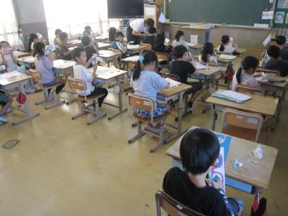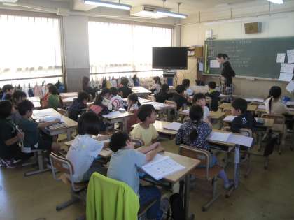 2年生の2クラスはそれぞれ図工と道徳の授業です。教科担任で授業を行っているので、クラス担任ではない先生が授業をしています。