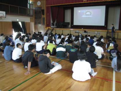 6年生は、体育館で「薬物乱用防止教室」の出前授業を学校薬剤師さんから受けています。薬物の危険を実感的に学んで、自らの健康を自らで守る生活を打ち立ててほしいと願います。