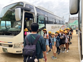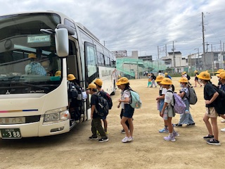 3年生の遠足はニフレル、万博記念公園、民族博物館へバスで行きます。バスに乗り込み、お隣同士シートベルトをした人たちは手を挙げています。