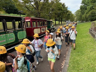民族博物館ではワークシートを手に、見学をしてわかったことを書き留める学習活動がありました。みんな意欲的に出発していきました。終わって知ったことで会話が盛り上がっていて面白かったです。帰り道も園内トレインとすれ違いました。