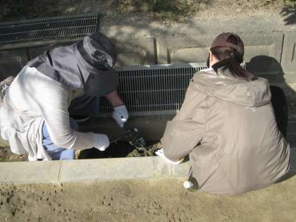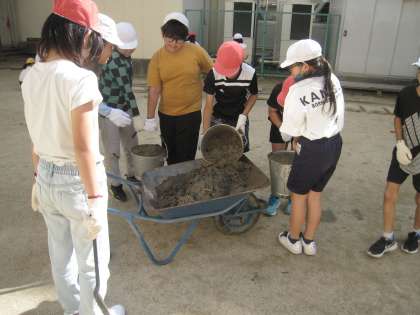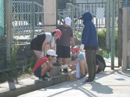 5年生・6年生はオープンスクール二日目の午後は側溝掃除でした。あらかじめ教員の方で溝の蓋を外しておき、ボランティアの保護者も一緒に、溝から泥を外側にすくっては出します。午後の陽射しが結構暑くなっていましたが、保護者の方々も一緒にみんなで力を合わせました。