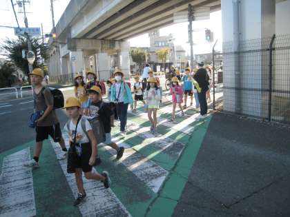 朝の登校の様子(先週)です。1列の登校班が美しいです。旗持ち当番のお母さんに見守れて渡ります。この日も手つなぎの姿を見ました♪
