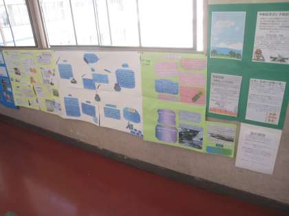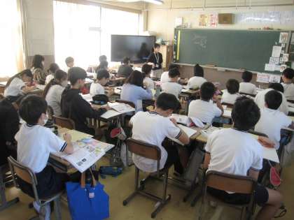 6年の1クラスは社会の授業、ロシア対日本という文字が黒板に見えます。日ロ戦争の学習かな、と思いました。廊下には第二世界大戦の時の日本に起きた状況のレポートがみっちり掲示されています。