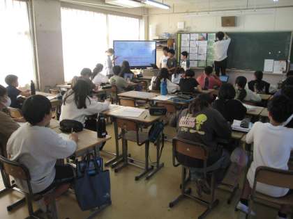 6年生の1クラスでは、国語で「やまなし」についての調べ学習で調べてまとめたレポートをグループごとに発表しています。全員が静かに興味を持って聞いていて、学ぶ姿勢が素晴らしいです。