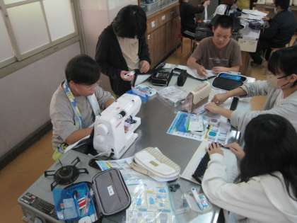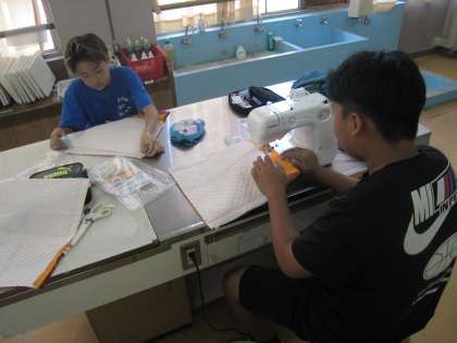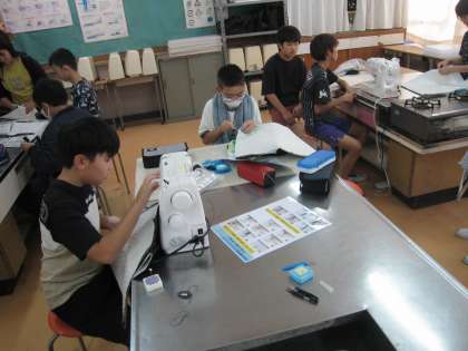6年生の1クラスが家庭科室にいます。ナップサップを手づくりで作ります。グループになって、みんな真剣に縫っています。