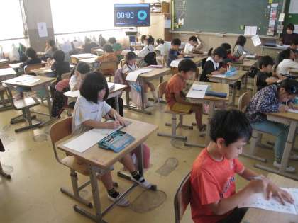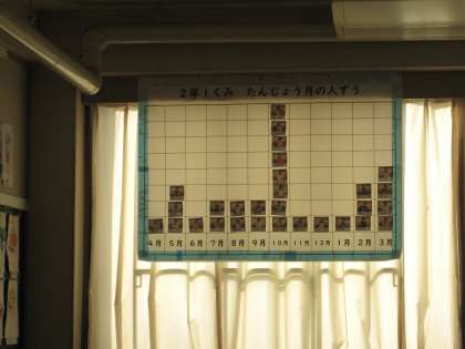 2年生の1クラスは、テストです。真剣に問題に向き合っている姿が教室に「集中」の空気を作っています。教室に月毎の誕生日の人が掲示されていて、今月(10月)が一番多く、その多さにびっくりです。