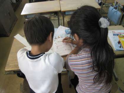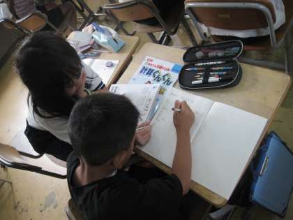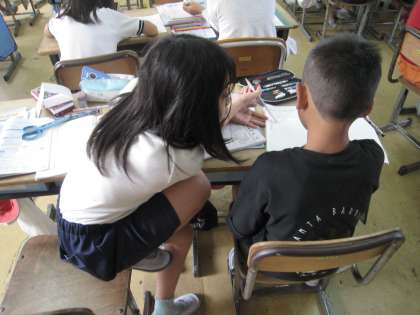 基本の解き方を学習したら、次は課題の問題プリントに取り組みます。1クラスでは、子どもたちで考え合って説明をしています。