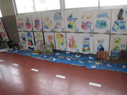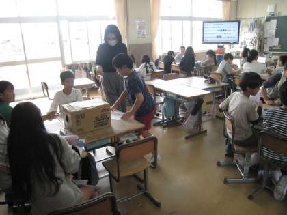 4年生の1クラスは英語、諸福小学校より英語の先生が来ての授業です。ボックスの中に手を入れて、触れたカードの形でそのアルファベットを当てます。小文字だそうです。ワクワクの顔でボックスに手を入れています♪廊下にはカラフルなパフェの作品が飾ってあります。
