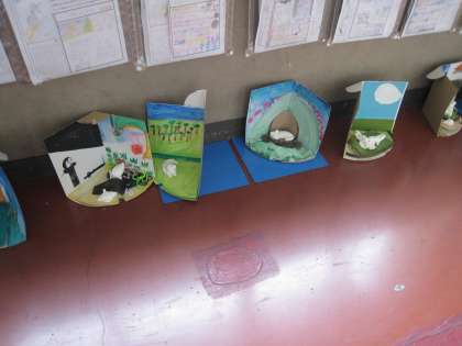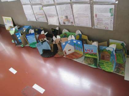 廊下には国語「ごんぎつね」のごんを粘土で作ったものと家ををつくったものを合わせて、ごんがいろいろな所で寛いでいます。