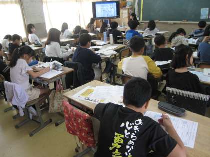 5年生の2クラスです。国語で和の文化ということで和菓子をとりあげて内容理解を積み上げています。廊下には、ハロウィーンでオバケの作品が飾られています。