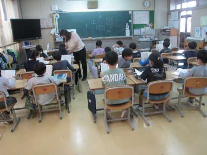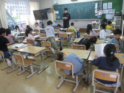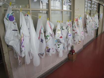 1年生の2クラスです。どちらも国語、漢字を学習した後、教科書を開けている、開いた教科書をたてて本を読む姿勢を取るところです。廊下にはポリ袋が装飾でオバケの早変わり、の作品が飾られています。どれもユーモラスです。
