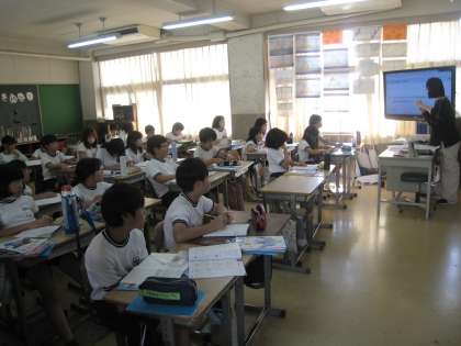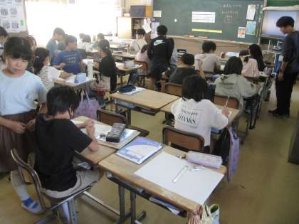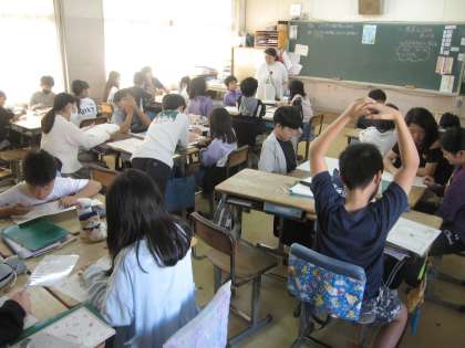 5年生は、各クラスで算数です。班で学び合う活動、個々の学びで交流を図る活動、全体で理解を確認しながら進めているクラスです。