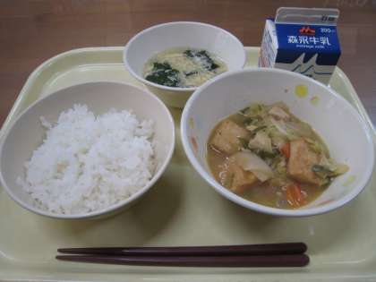 今日は和献立でした。厚揚げと鶏肉の味噌煮は、厚揚げの口当たりがとても良いのと味噌が美味しさを引き立てていて、個人的にも好きなメニューです。わか玉スープは、いつもにもまして卵がふんわりソフトにからまって、まろやかスープでした。ご飯は香りがよくどれもとてもおいしかったです。