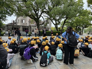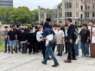 広島駅から市電に乗って降りたところが原爆ドームの前でした。近代的な町の建物と対比する鉄骨剥き出しのドームを前にみんないよいよ広島は来たという実感がわいてきたようです。