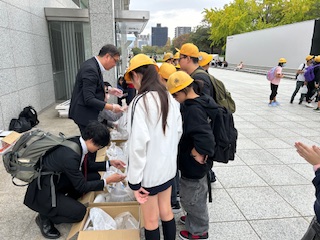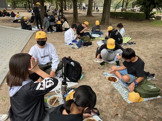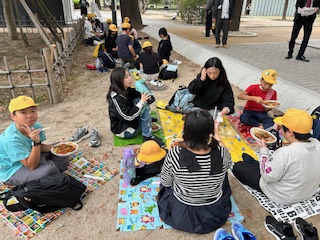 昼食は、ボリュームたっぷり広島焼きです。「おいし〜い」の声があがります。