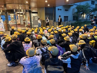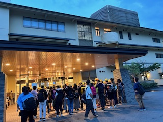 バスが坂を登ると上の方に明かりがきれいな建物が見え、バスの中がにわかにざわつきました。「きれい〜」「豪華や」と言っているうちに宿舎に到着。今日は良寛荘にお世話になります。実行委員さんが前に出て、宿舎の方にご挨拶をしました。