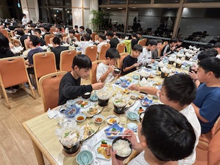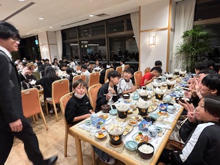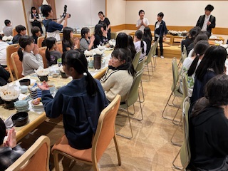 談笑、という言葉がぴったりな穏やかにおしゃべりしながらの夕食のひとときです。終わりは実行委員さんのリードで「ごちそうさまでした。」食器ごとに重ねてきれいにしました。
