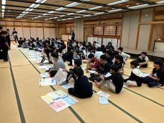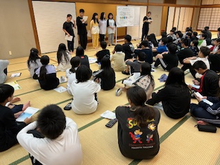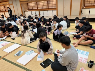 夕食後は、各部屋毎に今日学んだことを項目立てて整理し、その後大広間に集まり、実行委員さんたちの司会でペアトークです。