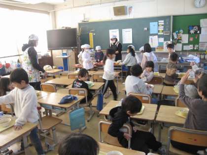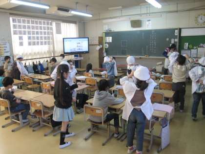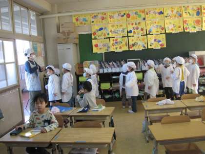 1年生の教室です。4時間目が終わると、給食当番はエプロンと帽子、マスクをつけて給食を取りに行く準備です。すっかり自分でエプロンを着たり、帽子に髪の毛を入れたりと上手になりました。2列にさっと並ぶのも早くなりました。それぞれの分担を運んで来ます。