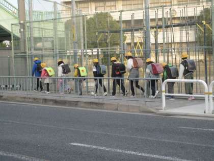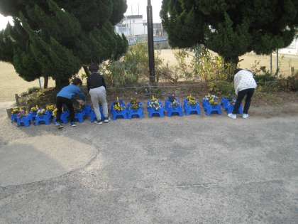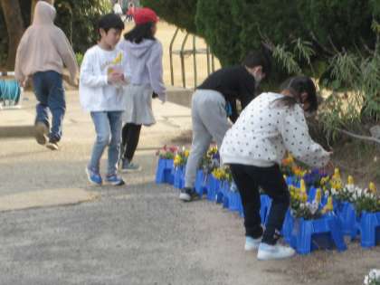 班の人数が多くても、毎朝きれいな1列を作って登校して来る班です。学校では、1年生が次々に来て水やりをしていました。パンジーがきれいですが、土の中から「○oー○o○」の芽が出てくる・・・はず。子どもたちは「○oー○o○」が何かわかりますね。楽しみです。