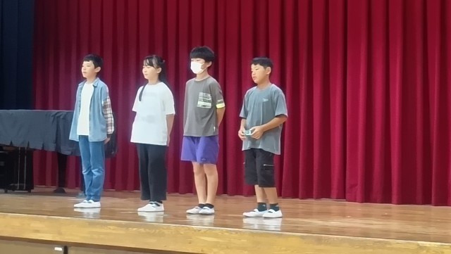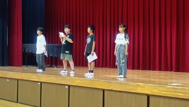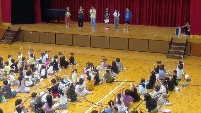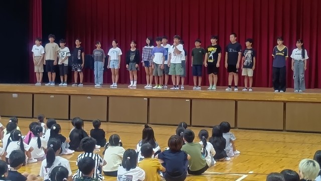 今日の集会は内容盛りだくさん。児童会の「中学校連携」、集会委員会の「〇×クイズ」、6年生による「折り鶴作成依頼」など児童の活躍の場も盛りだくさん。