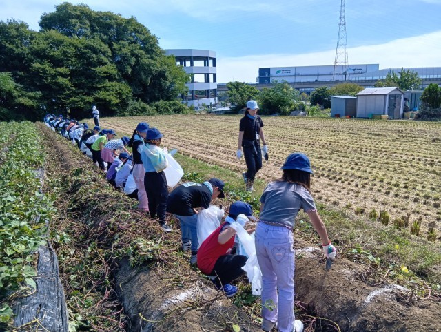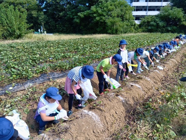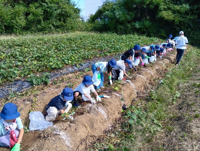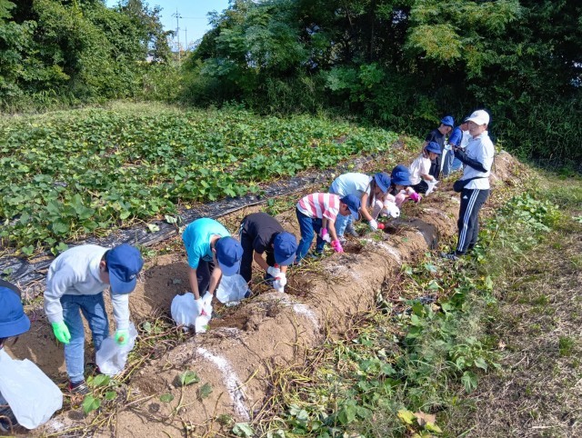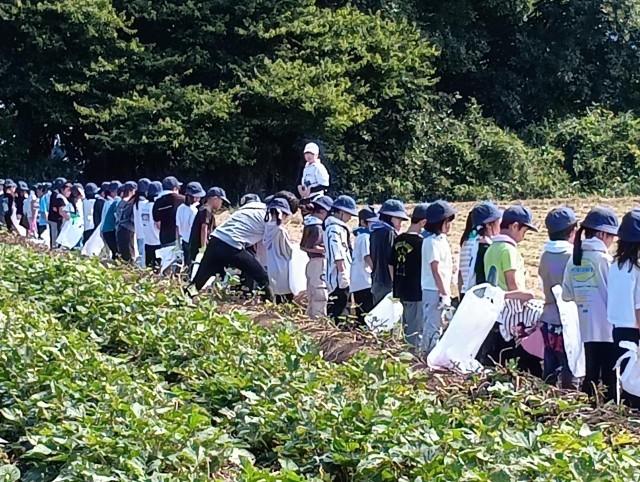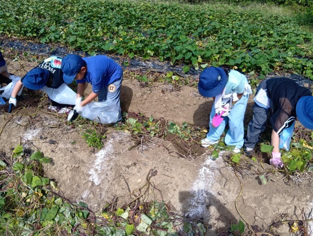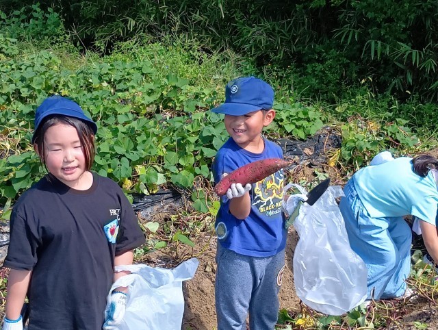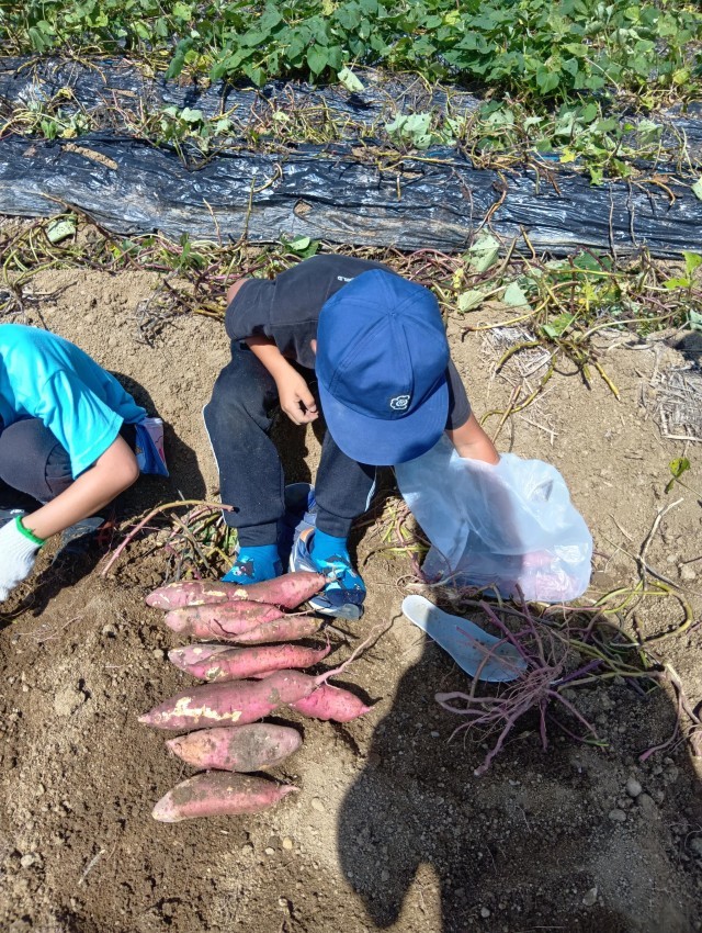 いも掘りに夢中の子どもたちです。今年は例年よりも豊作なようで、大きな株から、個数の多い株まで、色とりどりです。10個以上とれた子も多いようです。