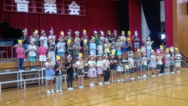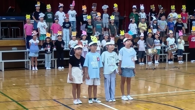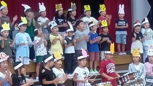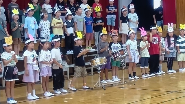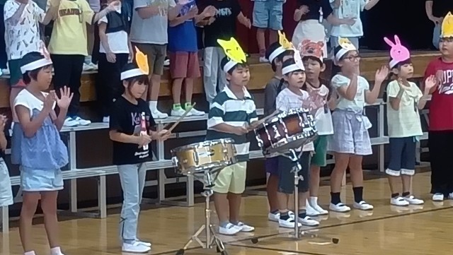 1年生はリズム打ちと「さんぽ」の斉唱。かわいい歌声に拍手喝采でした。