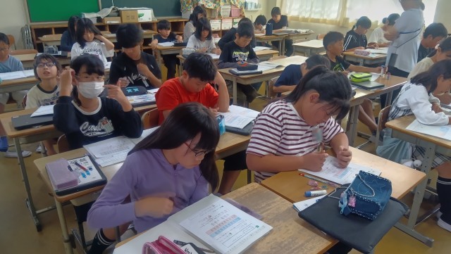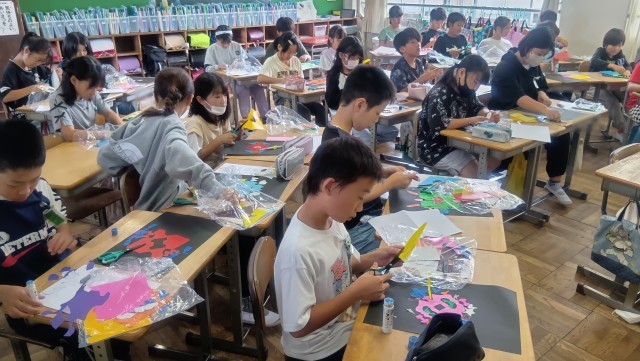 図工の時間。色紙を対象な形に切り取り、デザインを考えて張り付けています。なかなかの作品に仕上がっています。