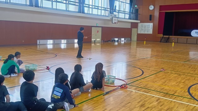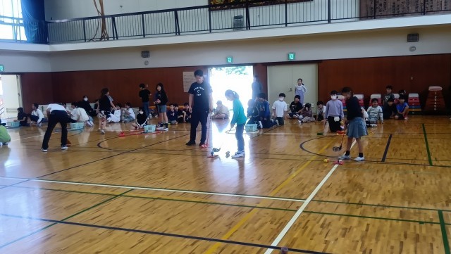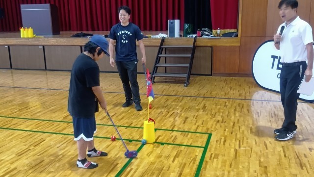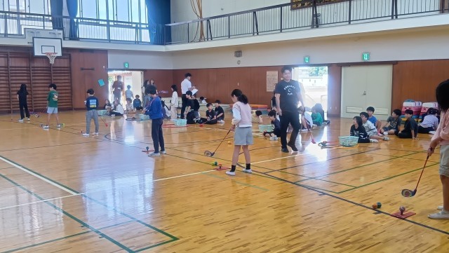 プロゴルファー岩田大河プロ(TEAM-i OSAKA)、ジュニアゴルフチーム連盟の方にお越しいただき「スナッグゴルフ」を教えていただきました。ゴルフ初体験の子どもが多くはじめは苦戦していましたが、みんなすぐに上達していました。