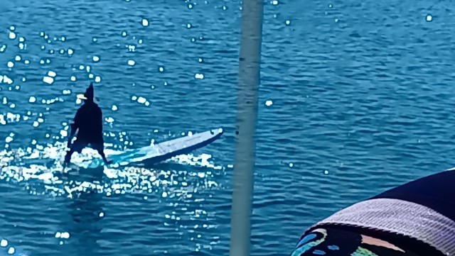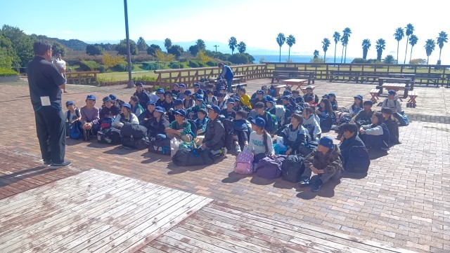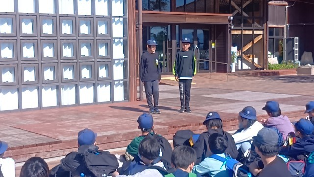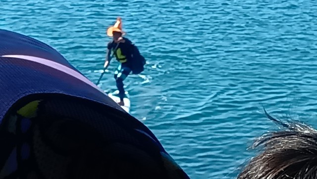 2日目お世話になった輝きの館の皆様とのお別れ。カッター体験の指導者の方がバスをサップで追いかけてお見送り。