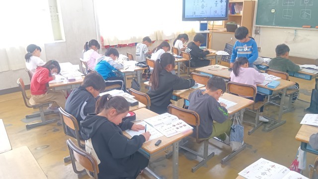 国語の時間、漢字練習を黙々と行う子どもたち。廊下からは教室に人がいるのを気が付かないくらいの静けさです。とても集中しています。