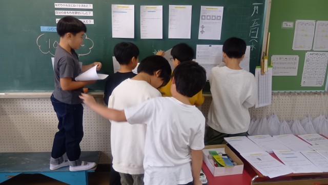 今日も自己調整学習中。自由進度で学習したプリントの採点も自分でどんどん進めていきます。
