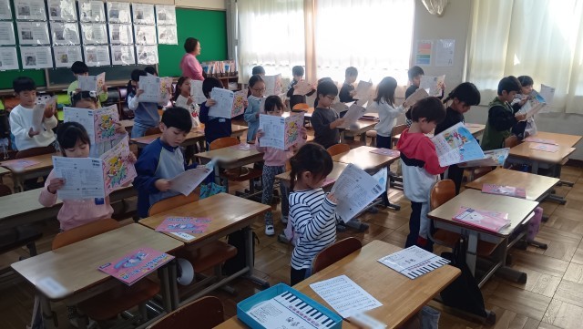 音楽の時間。元気な歌声で上手に歌っています。体育もとても元気に活動しています。