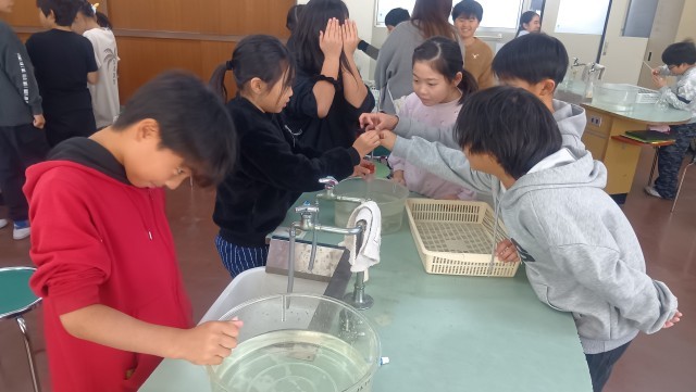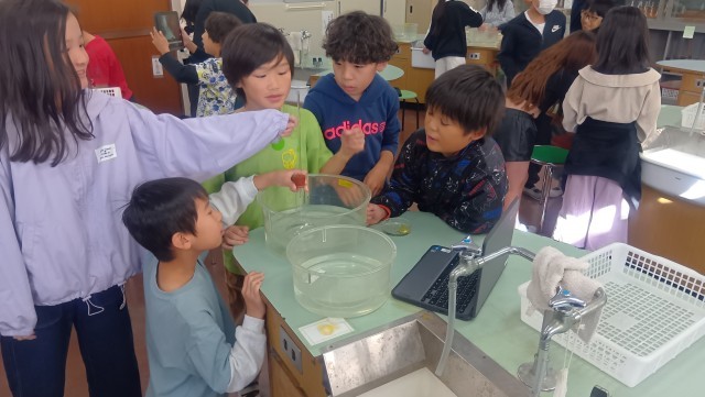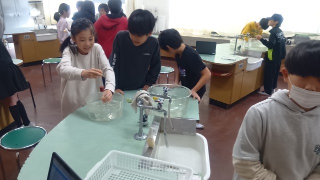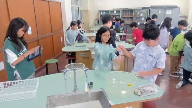 理科の実験、物の温度と体積の単元。今日は空気の温度変化により体積がどう変わるのかを調べています。実験がうまくいったときの子どもたちの笑顔が素敵です。