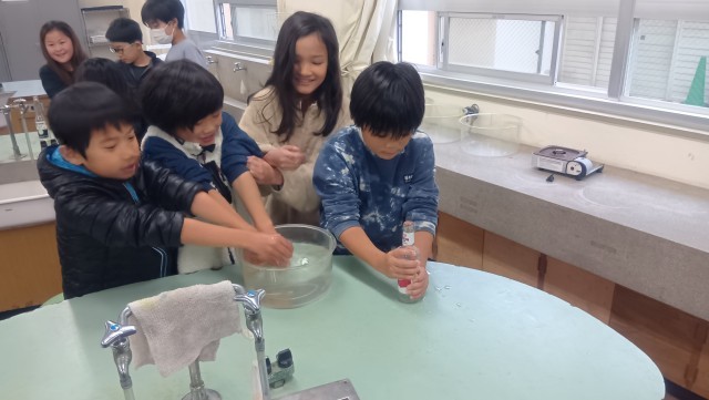 空気の温度差による膨張を利用した実験。10円玉が動く様子に満面の笑み。実験はやっぱり楽しいですね。