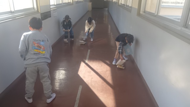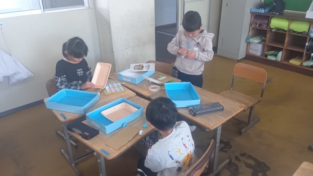 図工の時間、ヨットカーづくり。下敷きでパタパタいや、バタバタ葵で頑張っています。