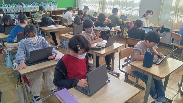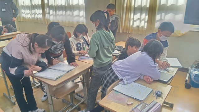 算数の時間、面積における底辺と高さの関係を勉強しています。友だちに丁寧に説明する姿がとても素敵。