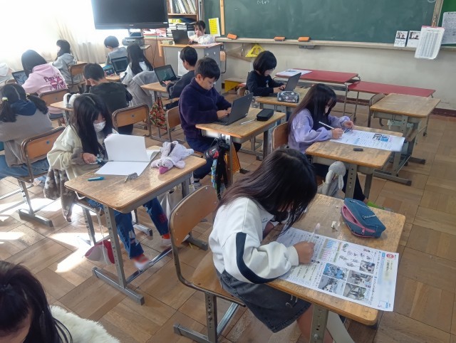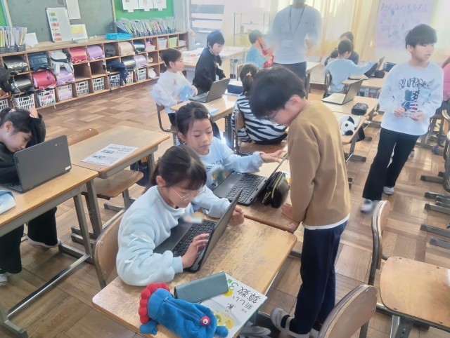 算数の時間、自分の考えをタブレットPCでまとめ、友だちと意見交流。入力スピードが上がってきています。