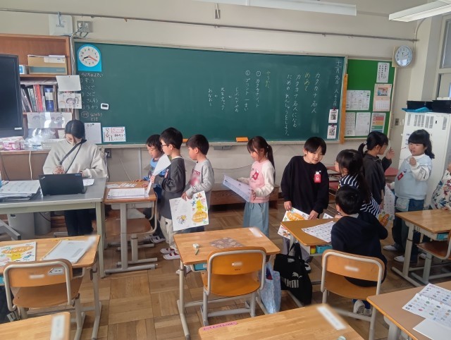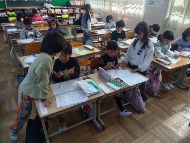 1年生も学びあい。問題の解き方に悩んでいる子を上手にサポートしています。教え方、とても上手ですよ。